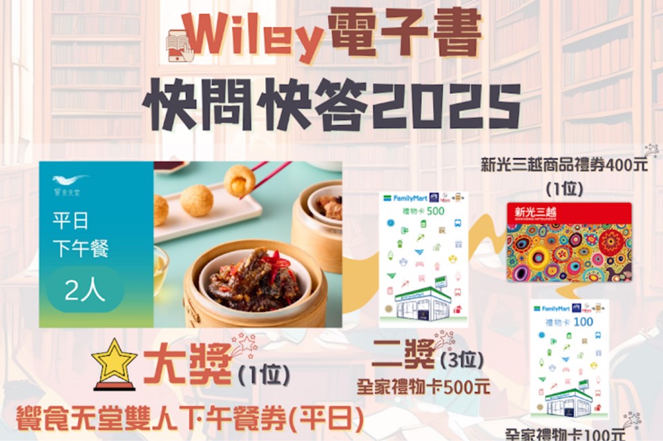 邀請您一同來參加"Wiley電子書快問快答 2025"。 除了可認識如何使用WOL平台上的電子資源外,更期待能在不同的資料需求情境中,學會操作獲取所需的學術文獻資料之方法。 【活動網址】https://forms.gle/dQKNx7xjjfAtdtZdA 【活動期間】即日起至2025/08/31 【活動對象】台灣學術電子書聯盟成員館全體師生與館員 【流程說明】不限參加次數,有參加臉書活動抽獎機會加3倍!詳見活動網址。 【注意事項】【校內IP】可立即點選題目中電子書; 校外請登入電子資源查詢系統,在【電子書】頁籤檢索【wiley電子書】,點選開啟【Wiley電子書檢索平台(部分全文)】,將題目點開之書名複製到平台做查找。 【活動贈品】 大獎【饗食天堂】雙人饗食天堂下午餐券(平日)*1名(1名) 貳獎【全家禮物卡】新臺幣$500元(3名) 參獎【新光三越】新臺幣$400商品禮券(1名) 普獎【全家禮物卡】 新臺幣$100元(30名) ****加碼獎:Wiley經典小物*5名 (價值NT$250/組)