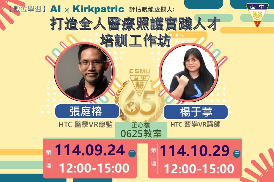 【數位學習】 AIxKirkpatric評估賦能虚擬人:打造全人醫療照護實踐人才培訓工作坊 AI x Kirkpatrick Assessment: Empowering Virtual Humans: Creating Holistic Healthcare Practices - Training Workshop 講師: 張庭榕 HTC 醫學VR總監 楊于葶 HTC 醫學VR講師 第一場日期:114.09.24(三) 第二場日期114.10.29(三) 時間:12:00-15:00 地點:正心樓0625教室 課程簡介 在醫學教育持續演進的今天,如何透過創新科技實踐全人醫療照護,已成為醫學教育的核心課題。本工作坊融合生成式 AI 虛擬人技術與Kirkpatrick學習成效評估模型,目標為提升全人照護情境下的同理溝通能力、臨床思辨力與情緒韌性等。課程設計強調臨床真實互動與跨專業協作,透過創新科技模擬訓練與AI回饋,推動醫學教育向以人為本、具備社會回應力的方向邁進,實踐醫學高教的USR價值。 本活動需兩場全程參與才報名,限額50名! 全程參與者將獲得結業證書。 參加對象:全校教師(請至TMS系报名) 認列點數:教師研習、數位學習1.5點 主辦單位:教學資源暨教師成長中心 noah0921@csmu.edu.tw 柯佩君 經費來源:高教深耕計畫1-5-1