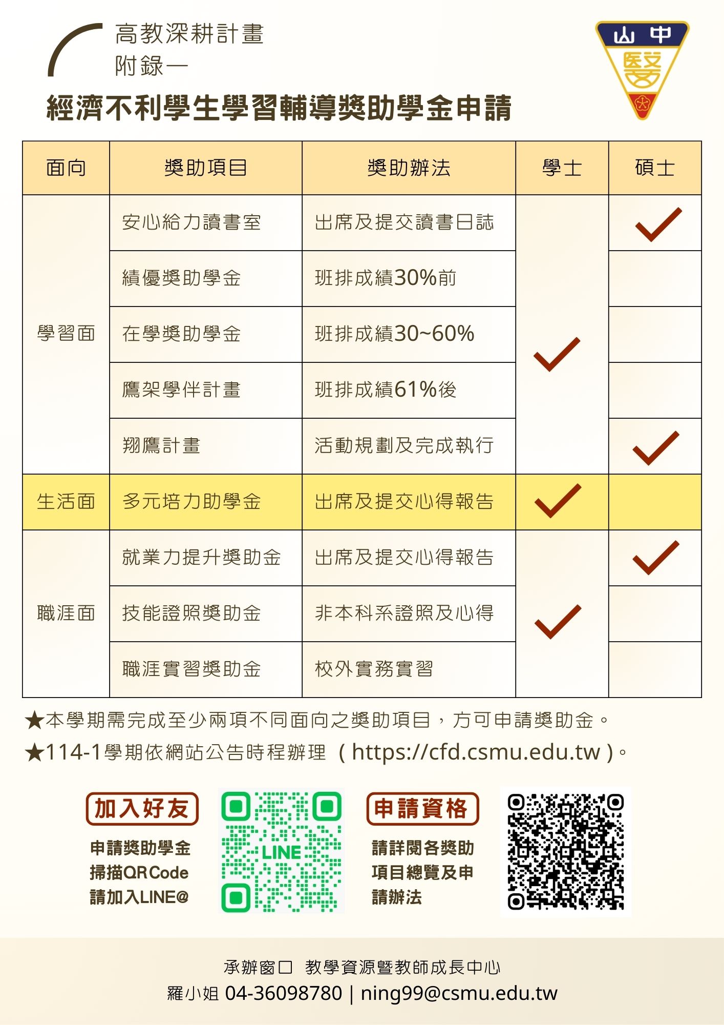 (一)附錄一獎助金相關資訊及申請方式,請詳閱:https://cfd.pse.is/2509 (二)欲申請【類經濟不利學生身分】10月份梯次,請於10/12前提交佐證資料,以利審查。 備註:填寫申請表後一律加入官方Line:@374igqrk聯繫,需以ee-class平台提交資料。 (三)獎助項目海報 【辦理單位】CFD教學資源暨教師成長中心羅小姐