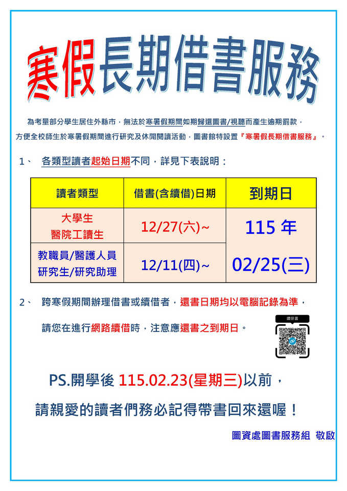 為考量部分學生居住外縣市,無法於寒暑假期間如期歸還圖書/視聽而產生逾期罰款, 且方便全校師生於寒暑假期間進行研究及休閒閱讀活動,圖書館特設置『寒暑假長期借書服務』。 1.跨寒假長期借書之到期日:115年2月25日(三) 2.各類型讀者跨寒假借書(含續借)起始日期如下: ▲大學生/醫院工讀生:12/27(六)~ ▲教職員/醫護人員研究生/研究助理:12/11(四)~ 3.跨寒假期間辦理借書或續借者,還書日期均以電腦記錄為準, 請您在進行網路續借時,注意應還書之到期日。 PS.開學後115.02.23(星期三)以前,請親愛的讀者們務必記得帶書回來還喔!