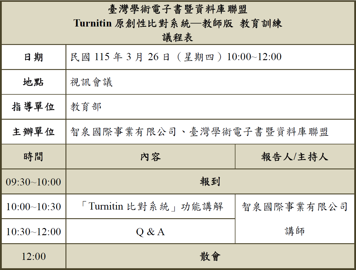 2026年上半年度Turnitin線上教育訓練開始報名,請留意報名截止時間。 廠商會於課前發送線上會議室連結及課程資訊給報名者。 完成課程並取得研習證明者,可認列【專業成長-學術倫理】1點。 故登錄線上課程時,需要將名稱輸入「中山醫學大學+真實姓名」以利核查。 時間:03/26(四)上午 10:00-12:00 報名截止時間:03/19(四)晚間 23:59 報名網址:https://forms.gle/mQ5GFdSRiuXi68Es7 備註: 1.登入後卻無法使用各項功能的老師,請email至ref@csmu.edu.tw以助解鎖。 2.新進老師請提供【姓名】、【email】及【系所單位】至ref@csmu.edu.tw,圖書館才可以在系統建立您的帳號。 3.圖書館已建立研究生帳號,建議學生先聯絡圖書館完成啟用,學生被加入您的課程名單即可上傳。 4.學生版教育訓練課會另行公告,或是您可以先行轉發下列訊息給學生。 【Turnitin原創性比對系統】【學生版】線上教育訓練:4/9 及 5/26 2026年上半年度Turnitin線上教育訓練開始報名,請留意各場次的報名截止時間, 廠商會於課前發送線上會議室連結及課程資訊給報名者。 兩場內容相同,擇一參加即可。 場次一: 時間: 2026/04/09(四)10:00-12:00 報名截止時間:04/02(四)晚間 23:59 報名網址:https://forms.gle/D6nXRJ47TefE9KC39 場次二: 時間: 2026/05/26(二)14:00-16:00 報名截止時間:05/19(二)晚間 23:59 報名網址:https://forms.gle/Vxn1H3F8EkTJXSRA9 尚未啟用帳號的研究生,以及如有【個人】使用系統需求的大學生,請提供姓名、email及系所單位至ref@csmu.edu.tw,由圖書館確認及建立帳號。
