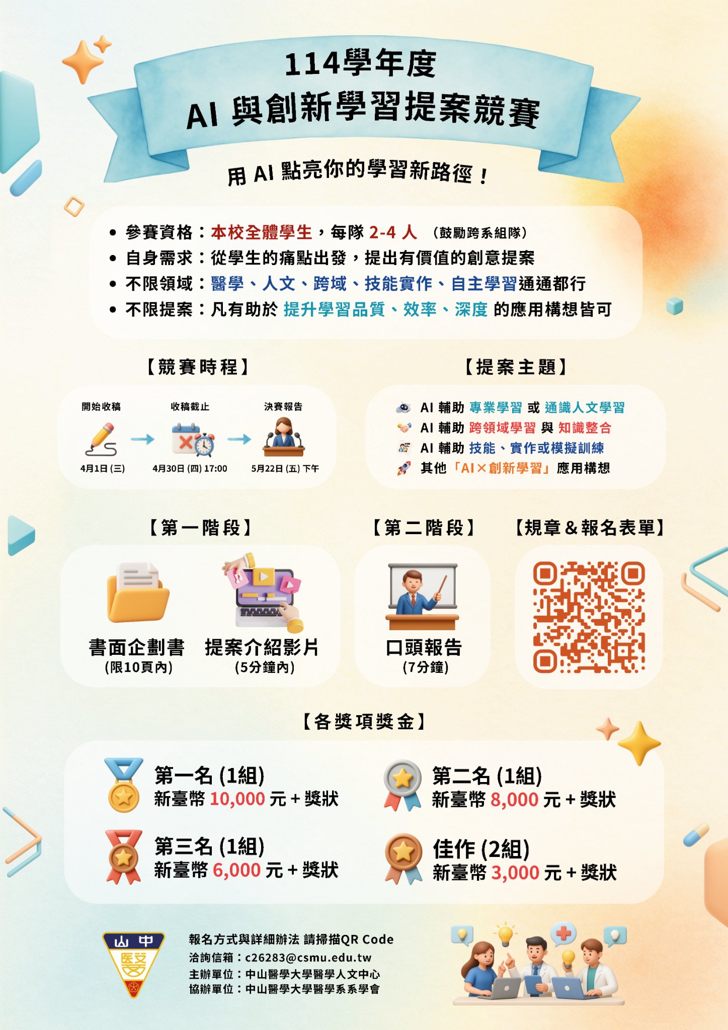 ▌競賽主題 以「AI與創新學習」為核心,不限於課堂或教案設計,凡有助於提升個人或群體學習品質、效率之 AI 應用構想(含自主學習、跨域學習、技能訓練、團隊共學等)均可作為參賽主題 。 ▌參賽資格 本校在學學生 。每隊 2 至 4 人組成 ▌競賽辦法 本競賽採兩階段評選。第一階段為書面企劃書(70%)及提案介紹影片(30%)審查;第二階段為口頭發表 7 分鐘及評審問答 3 分鐘。詳細規則參閱附件競賽辦法 ▌重要期程 ・第一階段報名繳件截止:4月30日 (四) 17:00 前 ・第一階段通過名單公布:5月15日 (五) ・第二階段口頭發表:5月22日 (五) 下午 ・公布得獎名單:6月1日 (一) ▌獎勵方式 第一名 (1組):獎金 10,000 元及獎狀 第二名 (1組):獎金 8,000 元及獎狀 第三名 (1組):獎金 6,000 元及獎狀 佳作 (2組):獎金 3,000 元及獎狀 ▌辦理單位 ・主辦單位:中山醫學大學醫學人文中心 ・協辦單位:中山醫學大學醫學系系學會 ▌聯絡資訊 :cs26283@csmu.edu.tw ▌報名連結:https://reurl.cc/qpLjLy