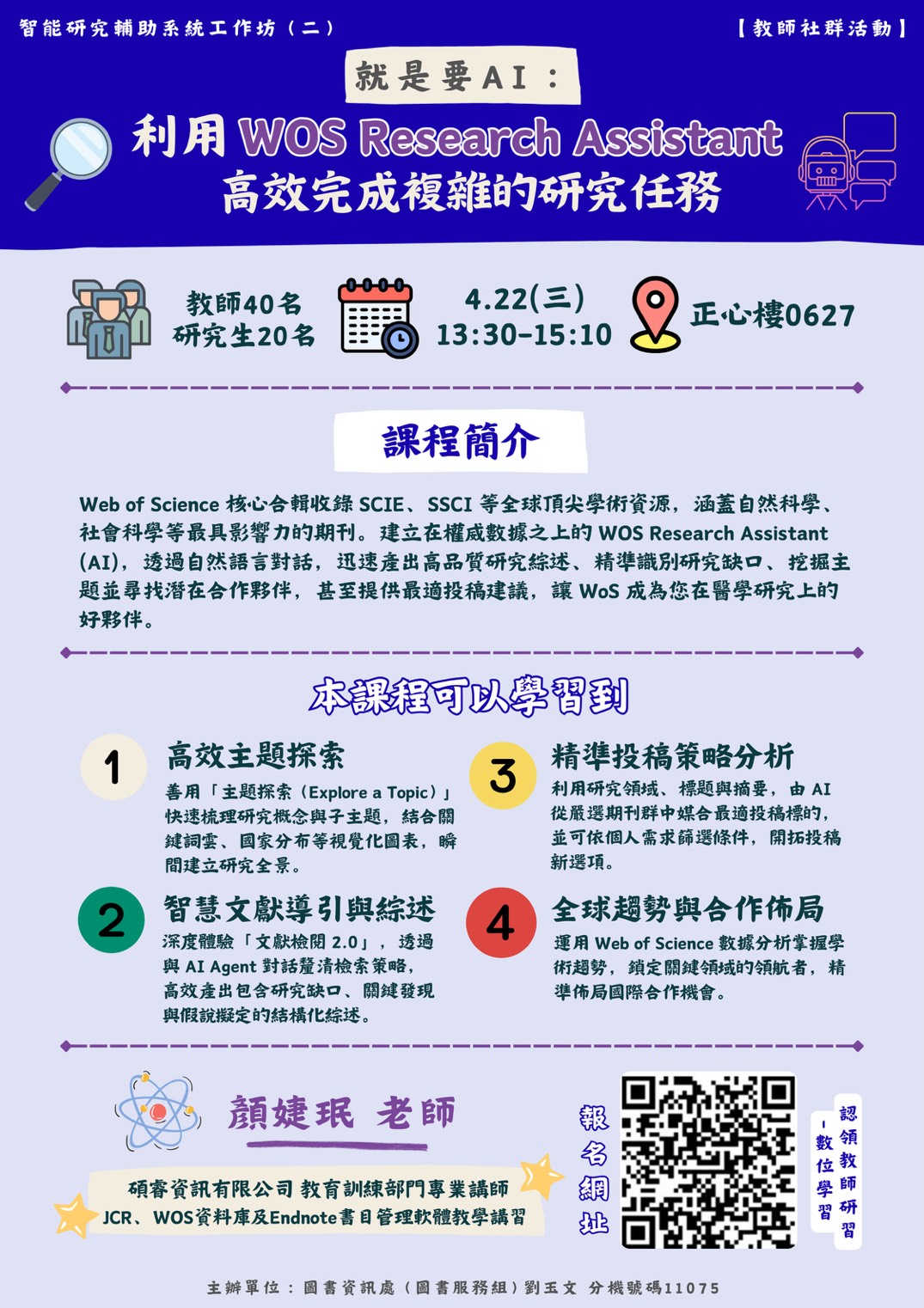 (1)如何發現研究熱點?即時追蹤研究趨勢? (2)善用WOS分析成為掌握主題、尋求合作夥伴的高手 (3)利用主題探索(Explore a Topic),自動生成簡潔明瞭的研究概念與主題總結,快速掌握關鍵內容;並進一步透過任務引導與情境提示,發掘重點核心文獻、主題研究趨勢、關鍵詞雲、國家分布的資訊圖表,藉此快速了解研究主題概況來開展研究。 (4)利用文獻檢閱2.0 的功能,透過與AI Agent 的對話過程,逐步確認檢索方向與策略,進而生成包含研究領域簡介、關鍵發現、識別研究缺口、尋找研究熱點、擬定假說等多維度的結構化綜述。 (5)利用尋找期刊,藉由稿件之標題、摘要或主題,由AI與相關可信任的期刊進行比對,並提供期刊資訊與評估分數,協助推薦與研究主題相關的投稿期刊建議。 報名網址: https://elib.csmu.edu.tw/AccessWeb/2801.php