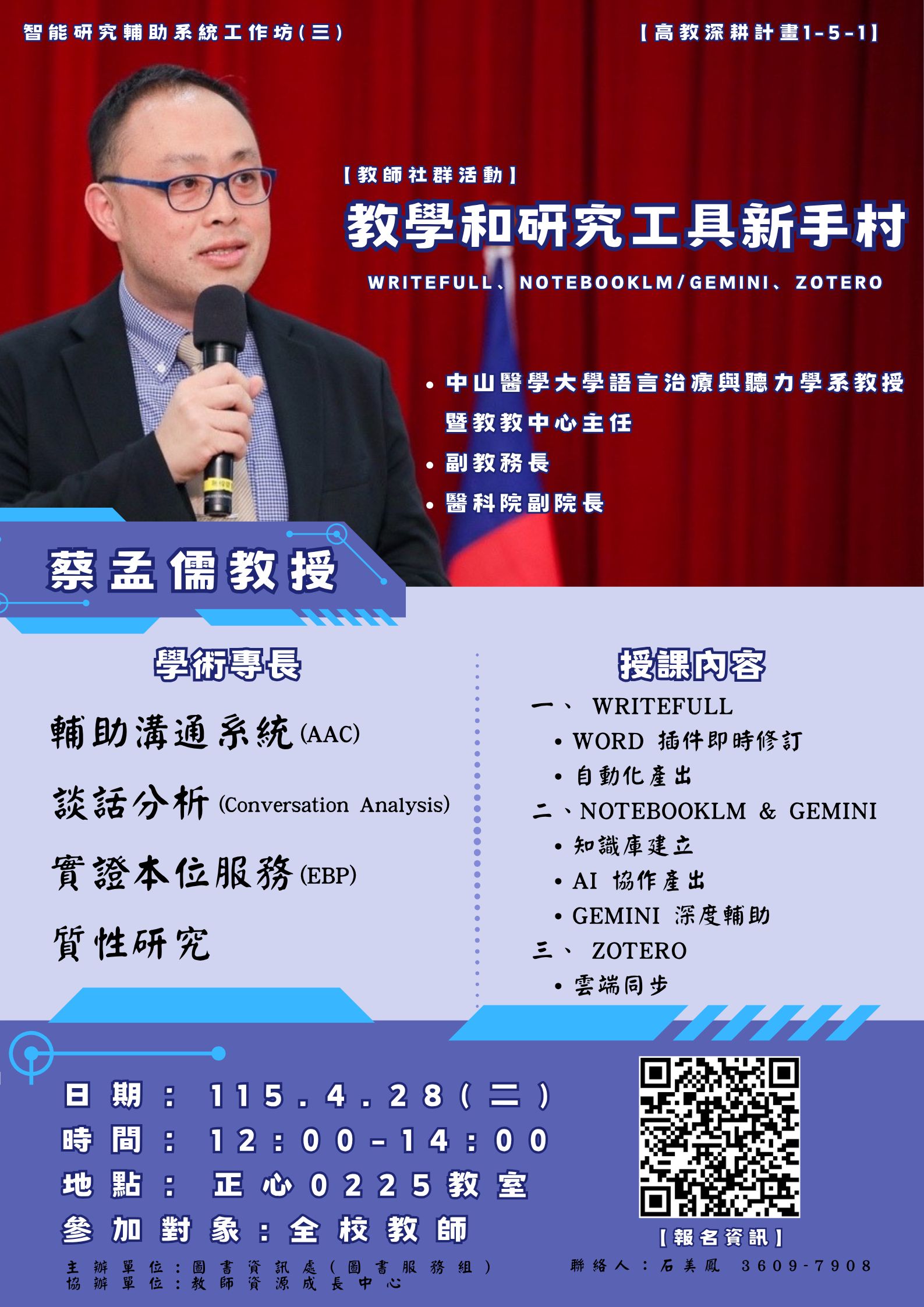 一、課程內容與資訊: (一)、 Writefull 1.Word 插件即時修訂: Full Edit 模式、學術句型套用 (Sentence Palette)。 2.自動化產出: 摘要生成標題、改寫技巧 (Paraphraser) 與引用漏 誤偵測。 (二)、NotebookLM 和 Gemini 1. 知識庫建立: 跨來源檔案匯入(PDF、YouTube、Google Docs)。 2. AI 協作產出: 對話式產出文獻回顧段落、自動生成心智圖與研究 報告。 3. Gemini 深度輔助: 跨來源資訊檢索與研習活動規劃建議。 (三)、 Zotero 1.雲端同步: 跨裝置管理您的完整個人研究圖書館。 二、報名網址:https://moocs2.csmu.edu.tw/course/latest