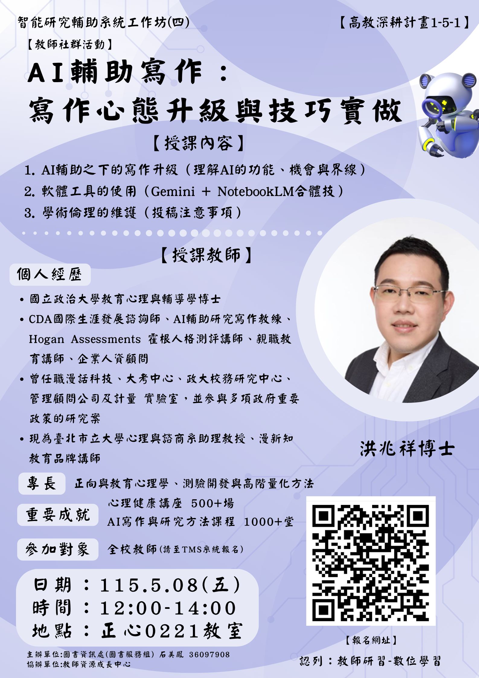 一、課程目標: 本工作坊旨在協助參與者全面掌握 AI 工具,以強化學術寫作效能,並深 入探討如何在恪守學術倫理的前提下,合規且高效地運用 AI 技術。參與 者將學會運用 AI 快速分析文獻、建構文獻回顧,並精準撰寫資料解釋等 學術段落。 二、課程內容與資訊: 1.AI輔助之下的寫作升級(理解AI的功能、機會與界線) 2.軟體工具的使用(Gemini + NotebookLM合體技) 3.學術倫理的維護(投稿注意事項) 三、上課資訊: 1.時間:115.05.08(五) 12::00-14:00 2.地點:正心樓0221教室 四、報名資訊: https://moocs2.csmu.edu.tw/course/3461